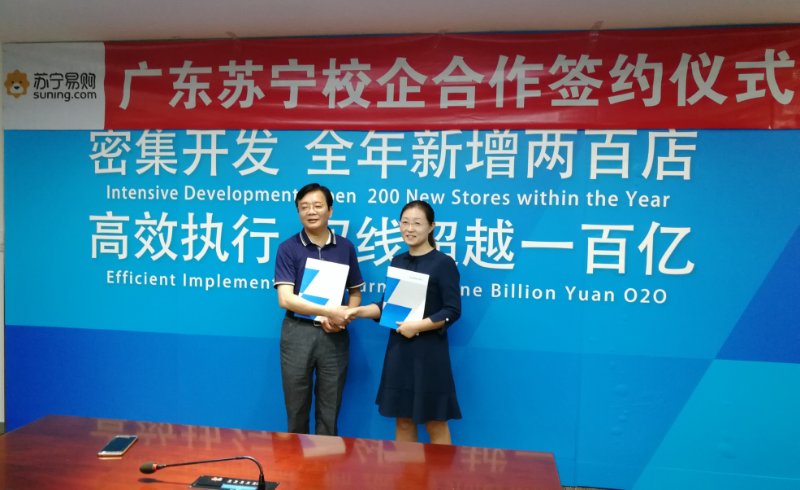 工商管理学院院长李新庚(左)和苏宁人力资源总监杨海琴(右)进行签约