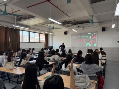 课程中,杨总对当前TikTok生态与内容电商模式做了具体讲解,结合我们出海 WeAbroad 的发展案例,从多国家运营体系、校园直播基地、物流与供应链优势、打造学生就业通道,针对短视频种草、达人带货、直播带货、“广告+达人+直播”三驾马车等几个方面进行了详细阐述,同学们打开了全新的国际视野。