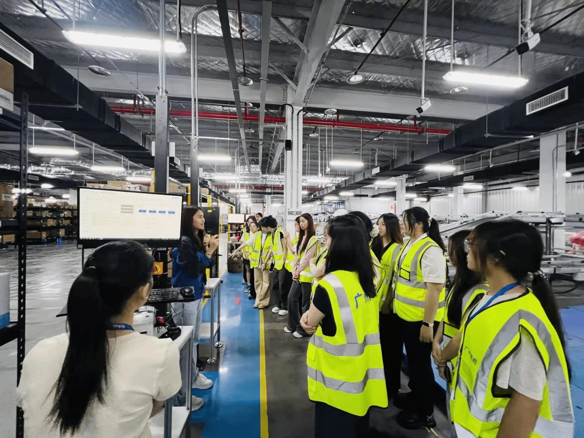在广州医药智慧物流中心领导的带领下,师生们依次参观了物流中心的收货区、数字化拣选区、智能分拣区、包装区及出库配送区。物流中心采用的智能硬件设备、物联网技术和数字化管理系统给学生留下了深刻印象。特别是物流中心通过智能分拣系统实现货物快速分拨、大件小件分离的高效作业模式,将物流效率提升5-6倍,展现了现代智慧物流的科技魅力。