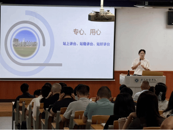 招建贞副院长围绕“专心、用心,站上、站稳、站好讲台”展开。提到工商管理学院当前专业多且“老”,学生人数多、类型杂且普高招生不稳定,教师结构待优化且“青椒”教师发展需重点关注;后续将以实现学生、教师“双满意”、助力学校“上层次、冲一流”为目标,培养复合型应用型人才并冲击省级教学成果奖与一流课程,具体将在9月启动2026级培养方案修订等工作,9-12月推进课堂建设与师资培训,同时按学期阶段落实教学检查、构建闭环管理,以AI赋能教学推动人才培养高质量发展。