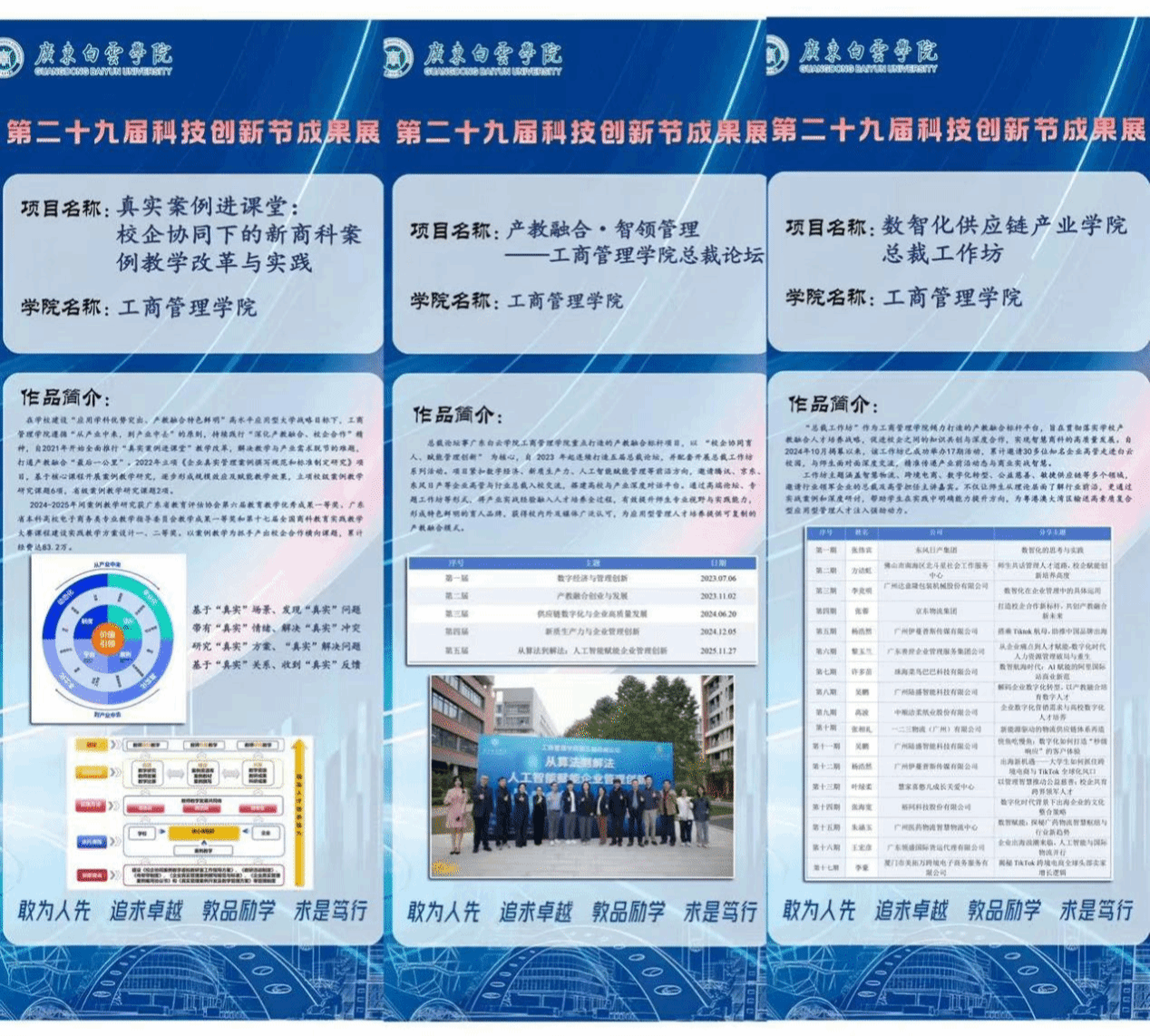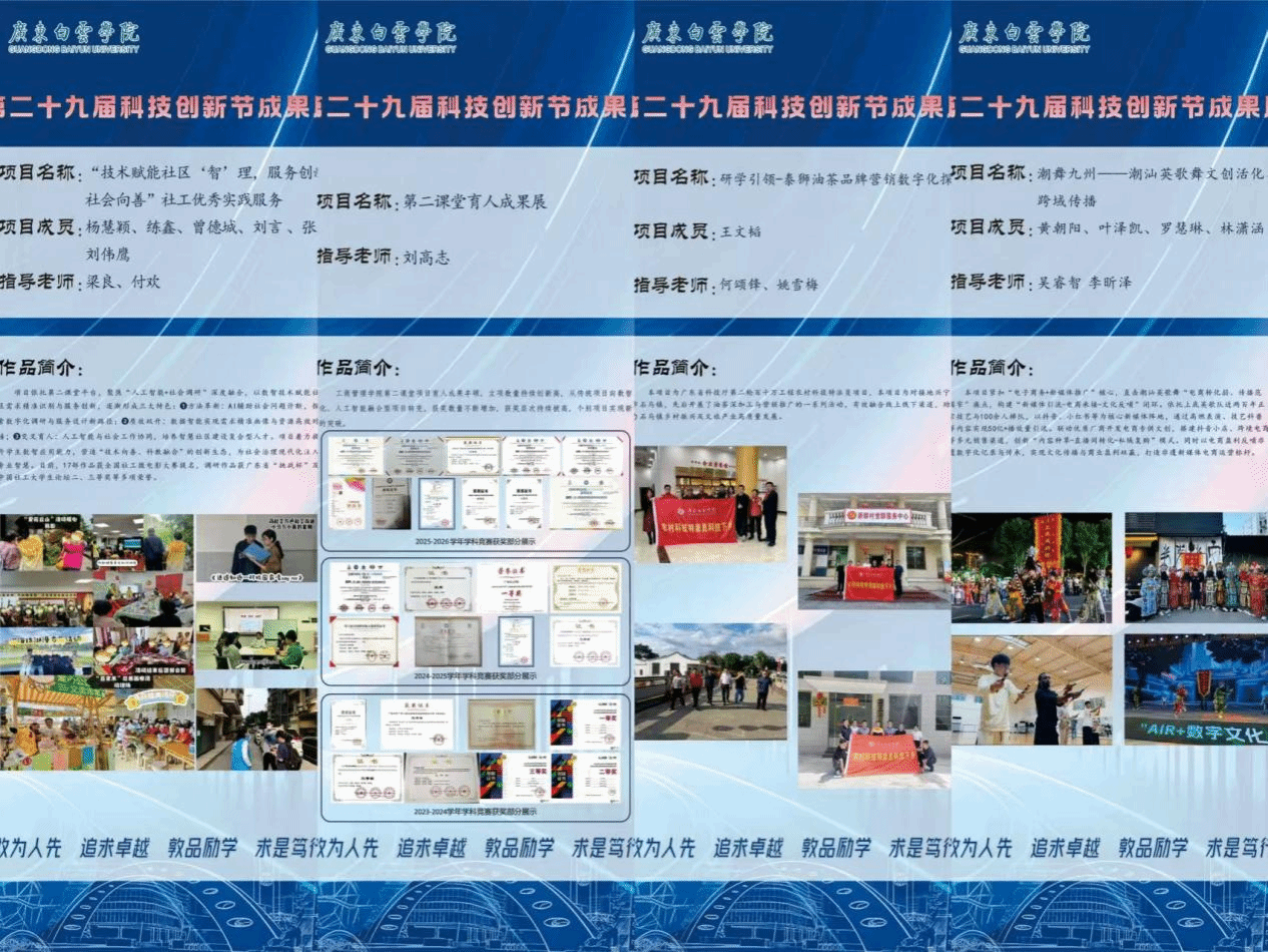 近日,广东白云学院第二十九届科技创新节成果展开展在即,工商管理学院紧扣国家产教融合政策导向与学校应用型人才培养定位,集中展示了一批具有鲜明学科特色与社会服务价值的创新成果,充分体现了学院“产教融合、理实一体、数智赋能”的育人理念与办学成效。