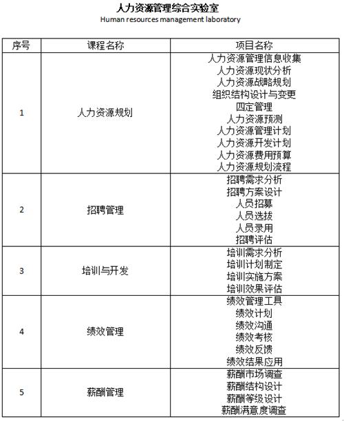 人力资源管理综合实验室配备有:60台学生电脑及多媒体教学设备,人力资源规划专业技能实训系统、招聘与甄选专业技能实训系统、培训与开发专业技能实训系统、绩效管理专业技能实训系统、薪酬管理专业技能实训系统等软件。主要承担《人力资源规划》、《招聘管理》、《培训与开发》、《绩效管理》、《薪酬管理》等课程的实验教学。
