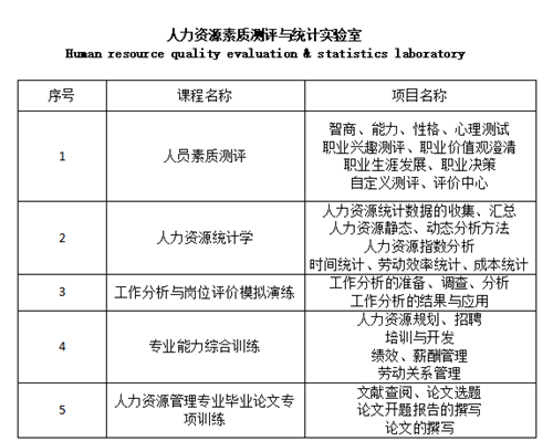 人力资源素质测评与统计实验室配备有56台学生电脑、多媒体教学设备、工作分析专业技能实训系统、人员素质智能测评系统等软件。主要承担《人员素质测评》、《人力资源统计学》、《工作分析与岗位评价模拟演练》、《专业能力综合训练》、《人力资源管理专业毕业论文专项训练》等课程的实验教学项目。
