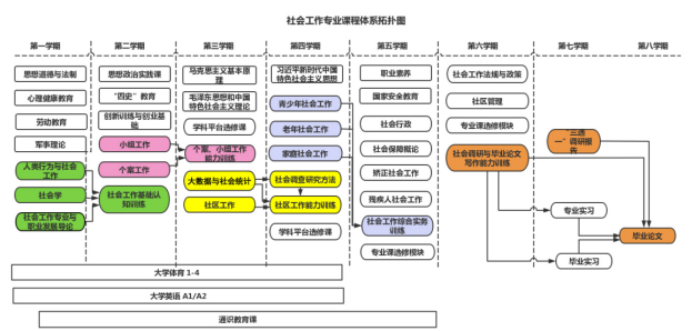 社会工作基础认知与服务规范训练,个案、小组工作能力训练,社区工作能力训练,社会工作综合性实务能力训练,社会调研与毕业论文撰写能力训练。